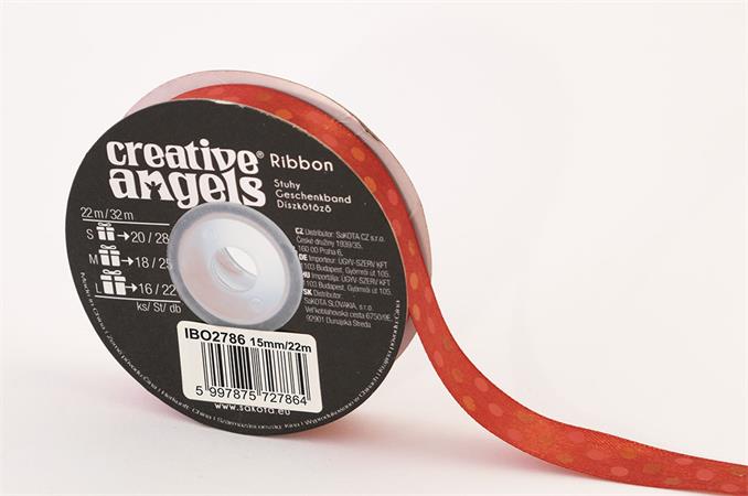 Szatén szalag, 15 mm x 22 m, piros vegyes pötyökkel