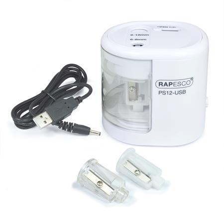 Hegyező, kétlyukú, asztali, elemes, USB töltővel, RAPESCO"PS12-USB", fehér