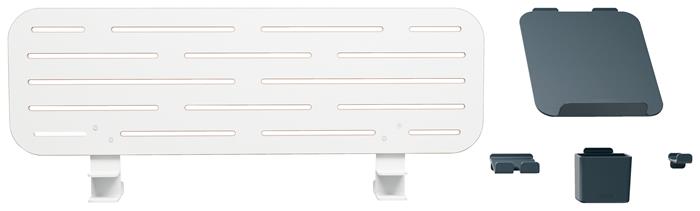 -egyszerűen helyezd az erős, 85%-ban újrahasznosított műanyagból készült tárolótartozékokat (1 x laptoptartó, 1 x okostelefontartó, 1 x tolltartó és 1 x fejhallgató akasztó) a táblára és hozd létre saját, személyre szabott munkaterületedet
