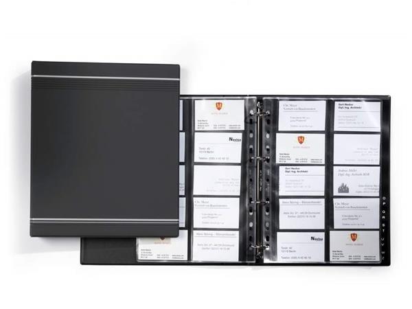 Névjegykártya gyűrűskönyv, matt felülettel, ezüst díszcsíkokkal.
