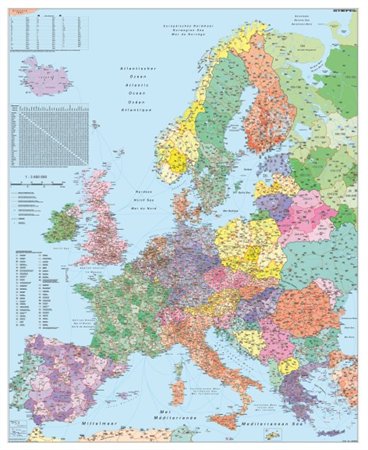 Falitérkép,100x140 cm, fémléces, Európa irányítószámos térképe, STIEFEL