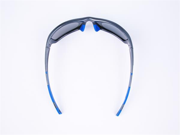 Sportnapszemüveg füstszínű polarizált lencsével, szürke műanyag kerettel.